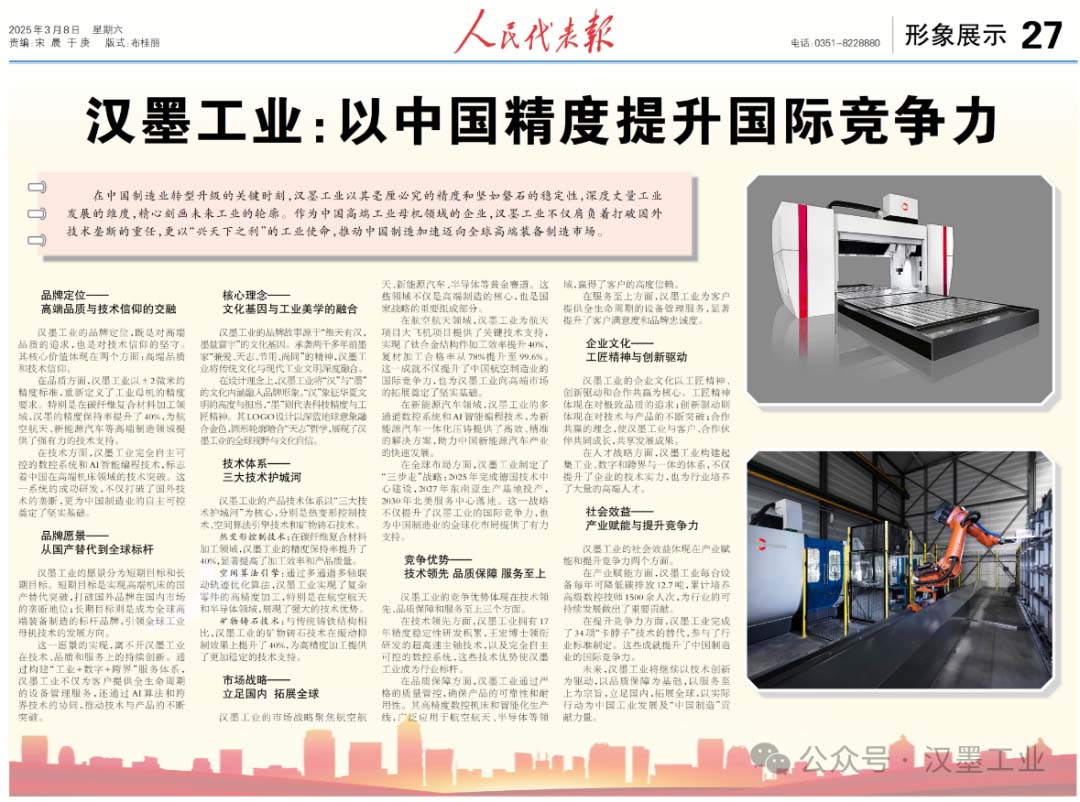 The company adheres to the core concept of "Precision measurement of industry, stability shaping the future", focusing on high-end intelligent equipment manufacturing and industrial automation digital technology solutions. It is committed to breaking foreign technological monopolies, promoting the transformation of China's manufacturing industry towards intelligence and digitalization, and achieving domestic substitution of medium and high-end industrial mother machines. Relying on the team of returned experts and the experience of Germany's Industry 4.0, Hanmo Industry has established a digital manufacturing system of "industrial Internet + artificial intelligence", successfully overcoming key technologies such as long-stroke CNC machine tools and 60-meter five-axis linkage turning and milling compound turning centers, and possesses and reserves over a hundred patent technologies. The company has been deeply engaged in the field of CNC machine tools for 17 years and has long served core military enterprises as well as Commercial Aircraft Corporation of China, BYD, CATL, etc.